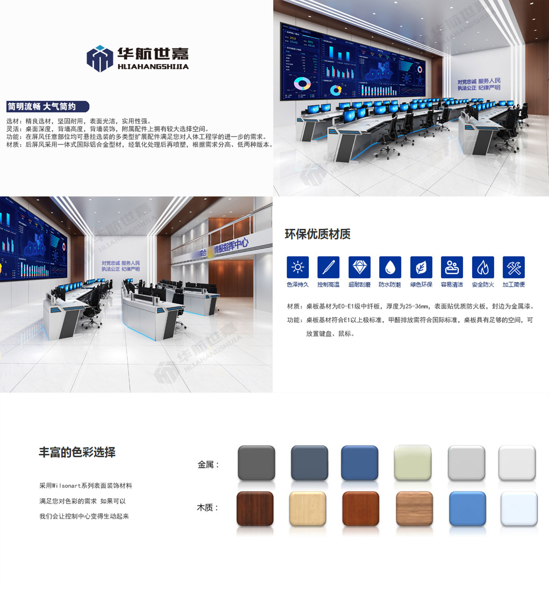 外观: 华航世嘉控制台后屏风采用一体式国际铝合金型材,经氧化处理后再喷塑,根据需求分高、低两种版本;主框架为2.0mm优质冷轧钢板,其他装饰件为1.5mm优质冷轧钢板表面处理:钢板部分经脱脂、酸洗、防锈磷化处理,表面经典喷塑;桌板基材为E1级中纤板,厚度为25-36mm,表面贴优质防火板,封边为金属漆。