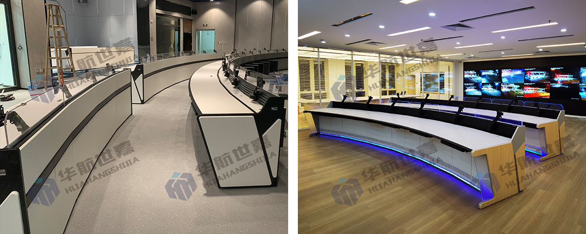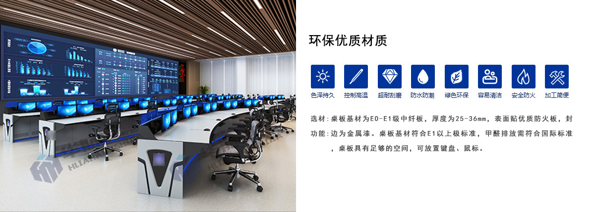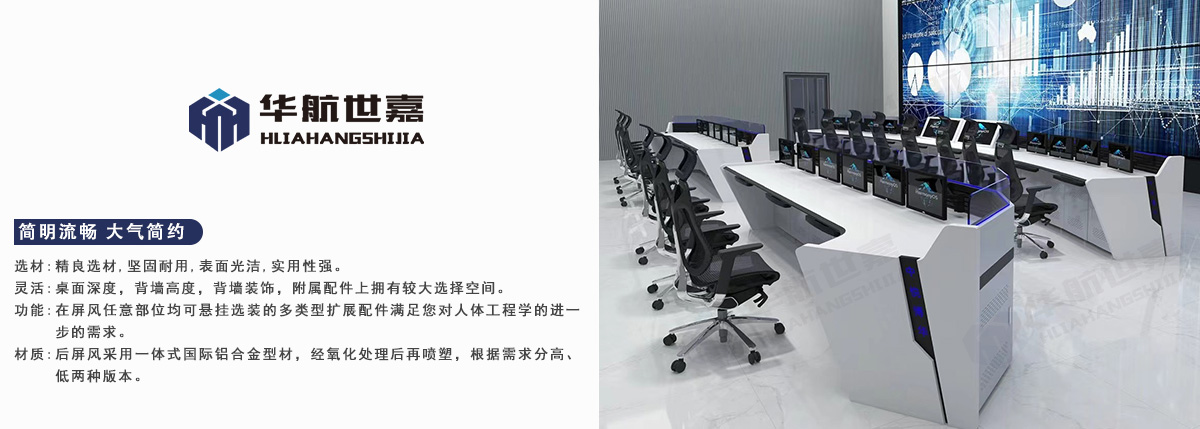 外观: 华航世嘉控制台后屏风采用一体式国际铝合金型材,经氧化处理后再喷塑,根据需求分高、低两种版本;主框架为2.0mm优质冷轧钢板,其他装饰件为1.5mm优质冷轧钢板表面处理:钢板部分经脱脂、酸洗、防锈磷化处理,表面经典喷塑;桌板基材为E1级中纤板,厚度为25-36mm,表面贴优质防火板,封边为金属漆。