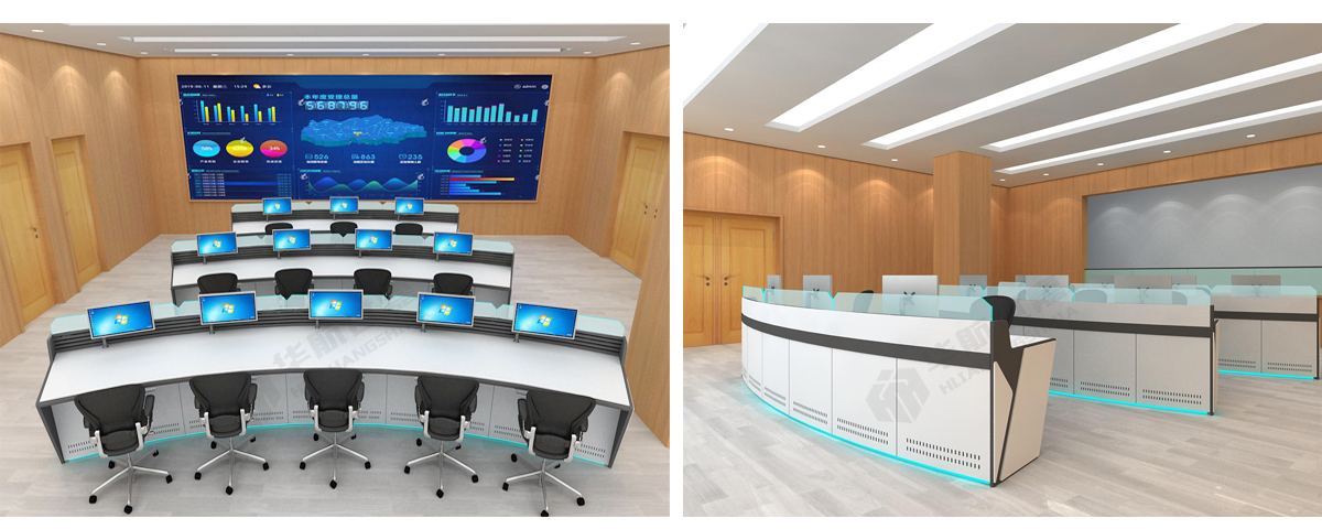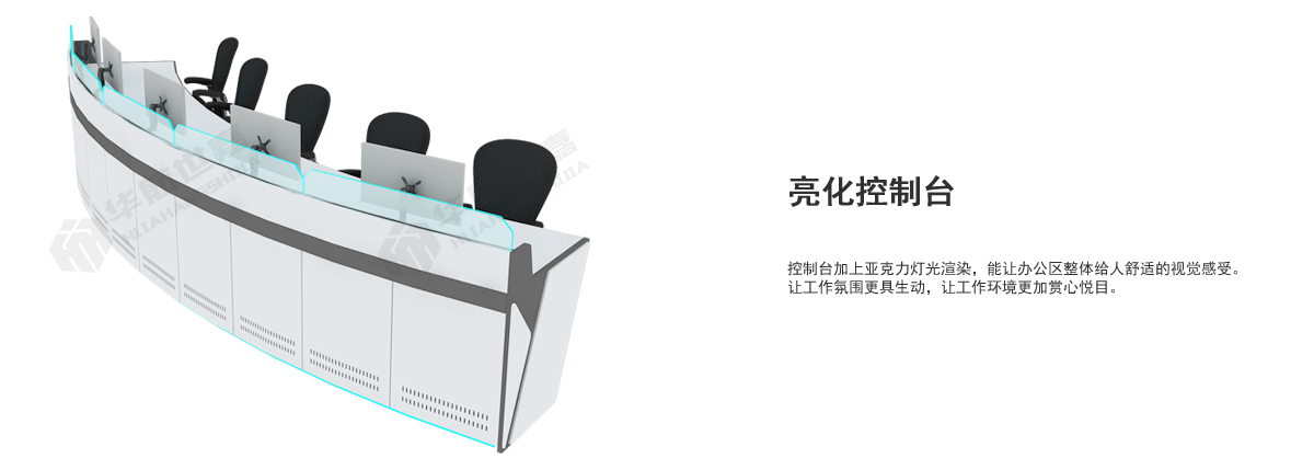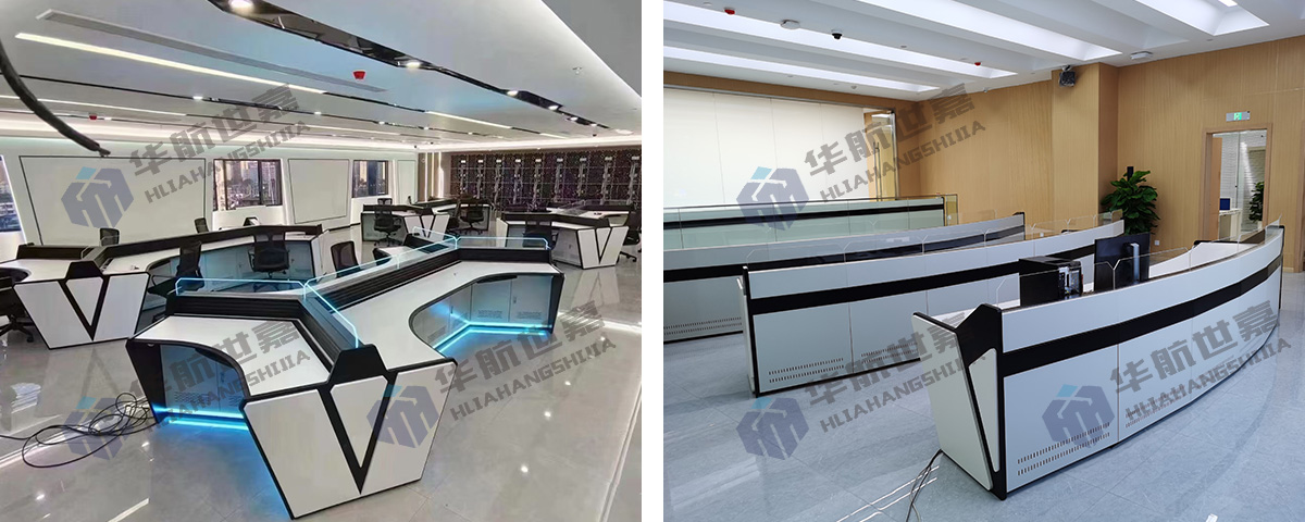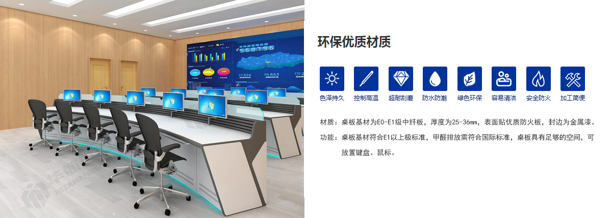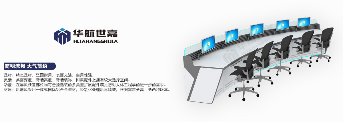 外观: 华航世嘉控制台后屏风采用一体式国际铝合金型材,经氧化处理后再喷塑,根据需求分高、低两种版本;主框架为2.0mm优质冷轧钢板,其他装饰件为1.5mm优质冷轧钢板表面处理:钢板部分经脱脂、酸洗、防锈磷化处理,表面经典喷塑;桌板基材为E1级中纤板,厚度为25-36mm,表面贴优质防火板,封边为金属漆。