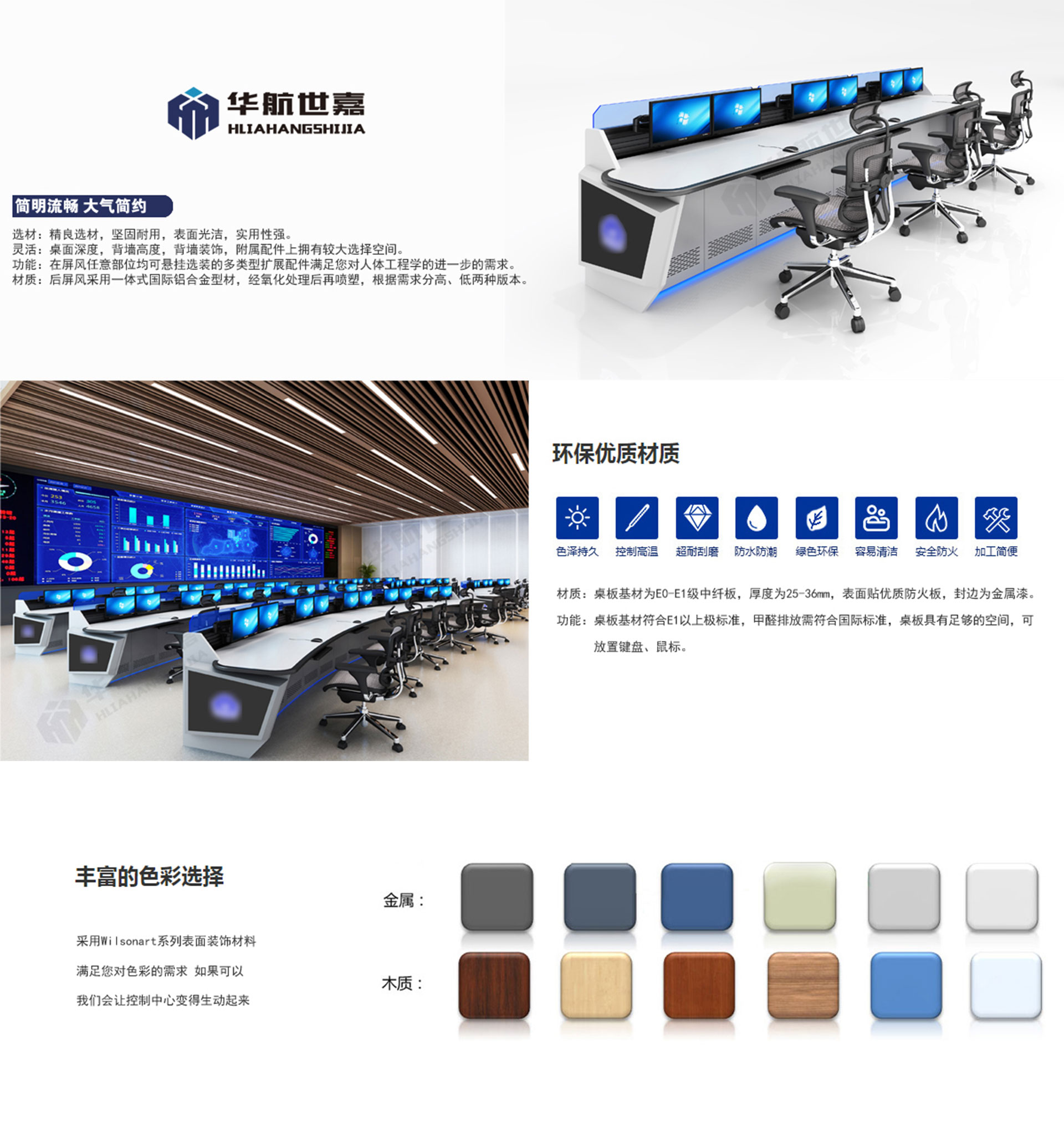 外观: 华航世嘉控制台后屏风采用一体式国际铝合金型材,经氧化处理后再喷塑,根据需求分高、低两种版本;主框架为2.0mm优质冷轧钢板,其他装饰件为1.5mm优质冷轧钢板表面处理:钢板部分经脱脂、酸洗、防锈磷化处理,表面经典喷塑;桌板基材为E1级中纤板,厚度为25-36mm,表面贴优质防火板,封边为金属漆。