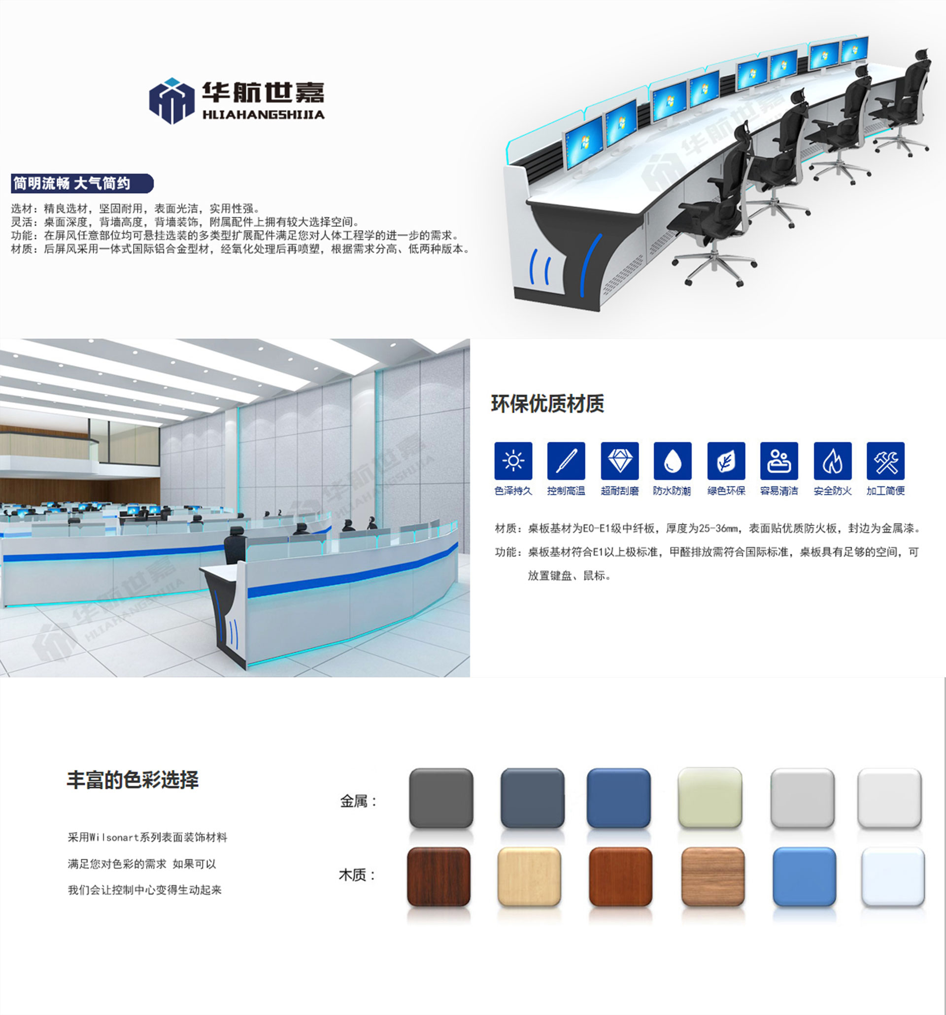 外观: 华航世嘉控制台后屏风采用一体式国际铝合金型材,经氧化处理后再喷塑,根据需求分高、低两种版本;主框架为2.0mm优质冷轧钢板,其他装饰件为1.5mm优质冷轧钢板表面处理:钢板部分经脱脂、酸洗、防锈磷化处理,表面经典喷塑;桌板基材为E1级中纤板,厚度为25-36mm,表面贴优质防火板,封边为金属漆。