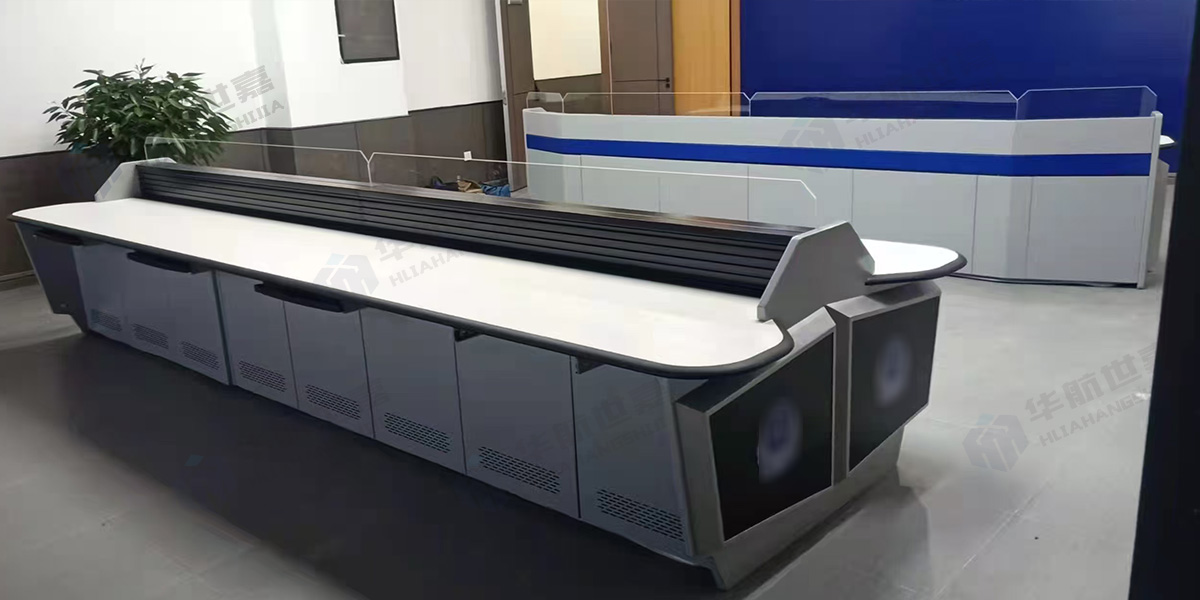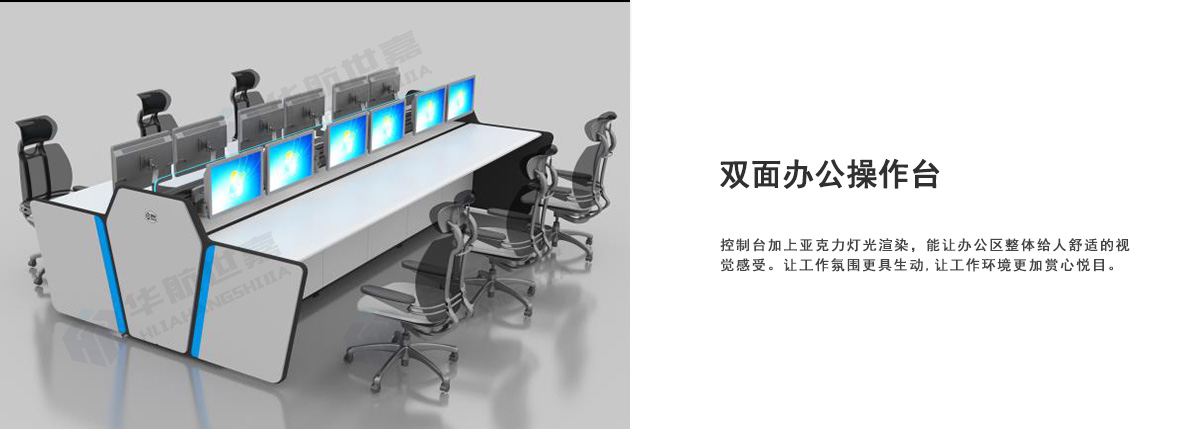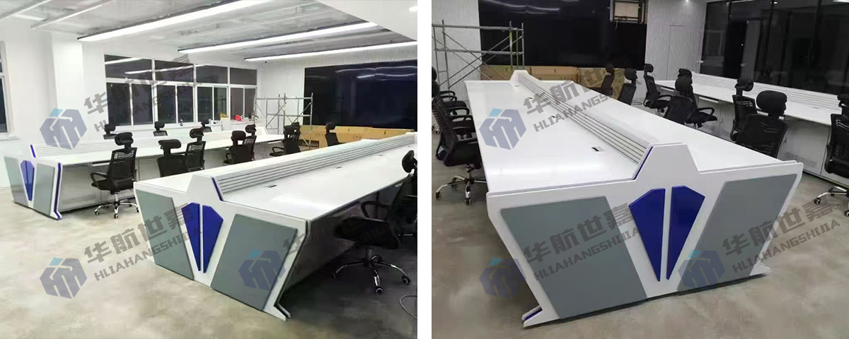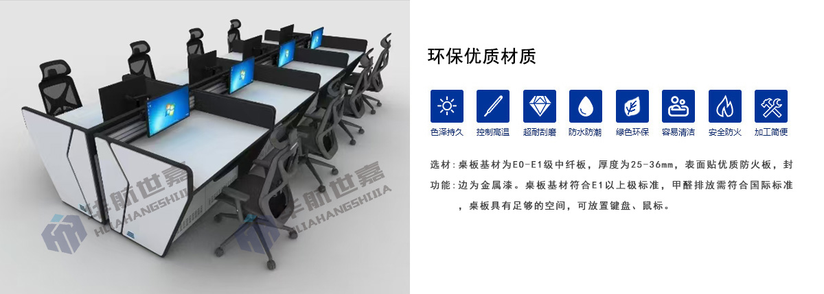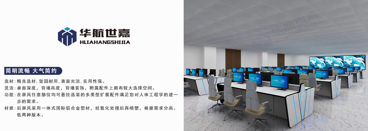 外观: 华航世嘉控制台后屏风采用一体式国际铝合金型材,经氧化处理后再喷塑,根据需求分高、低两种版本;主框架为2.0mm优质冷轧钢板,其他装饰件为1.5mm优质冷轧钢板表面处理:钢板部分经脱脂。
