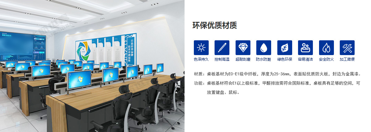 外观: 后屏风采用一体式国际铝合金型材,经氧化处理后再喷塑,根据需求分高、低两种版本;主框架为2.0mm优质冷轧钢板,其他装饰件为1.5mm优质冷轧钢板表面处理:钢板部分经脱脂、酸洗、防锈磷化处理,表面经典喷塑;桌板基材为E1级中纤板,厚度为25-36mm,表面贴优质防火板,封边为金属漆。
