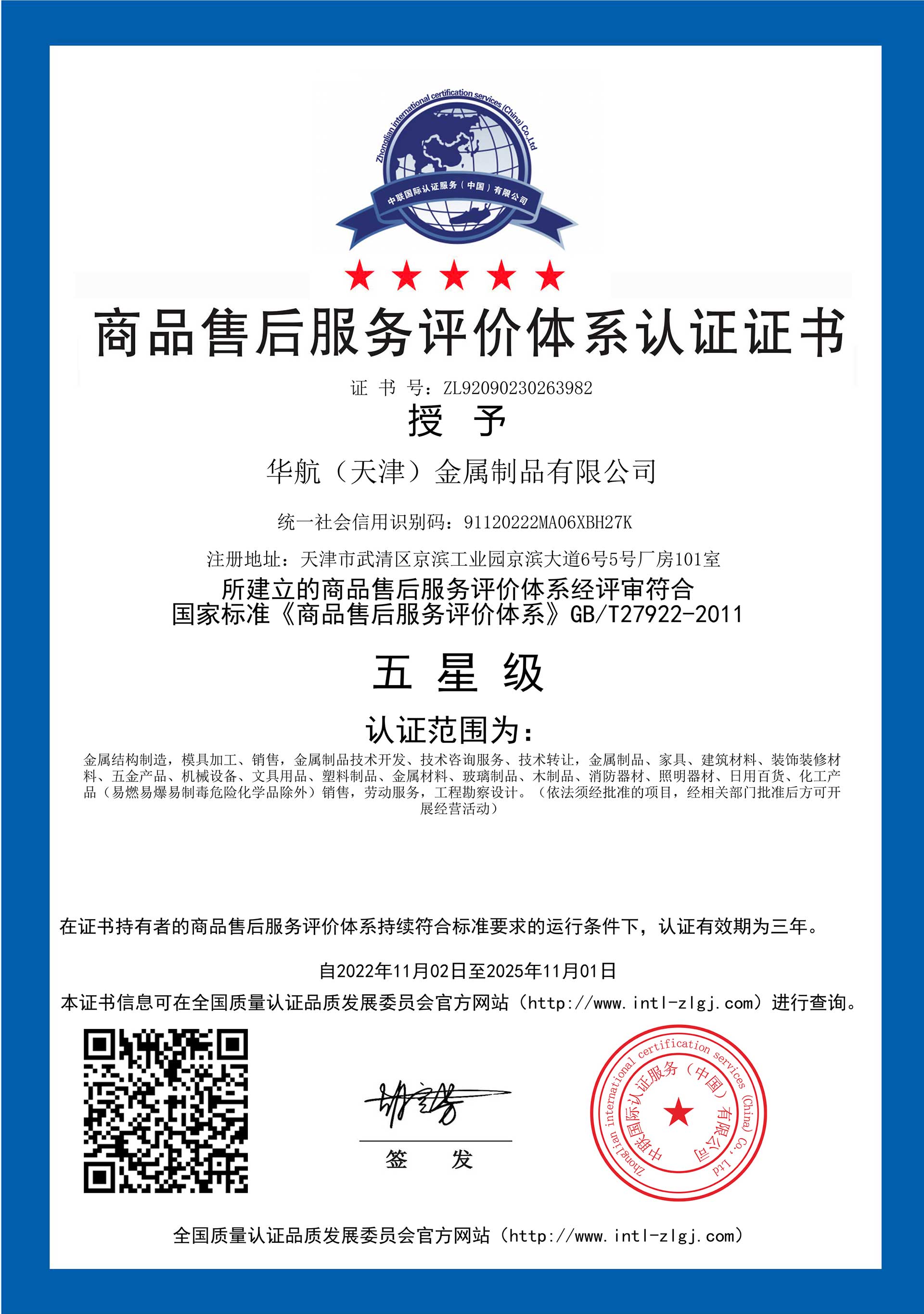 商品售后服务评价体系认证证书